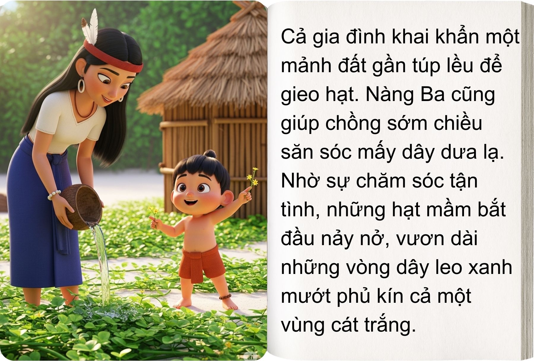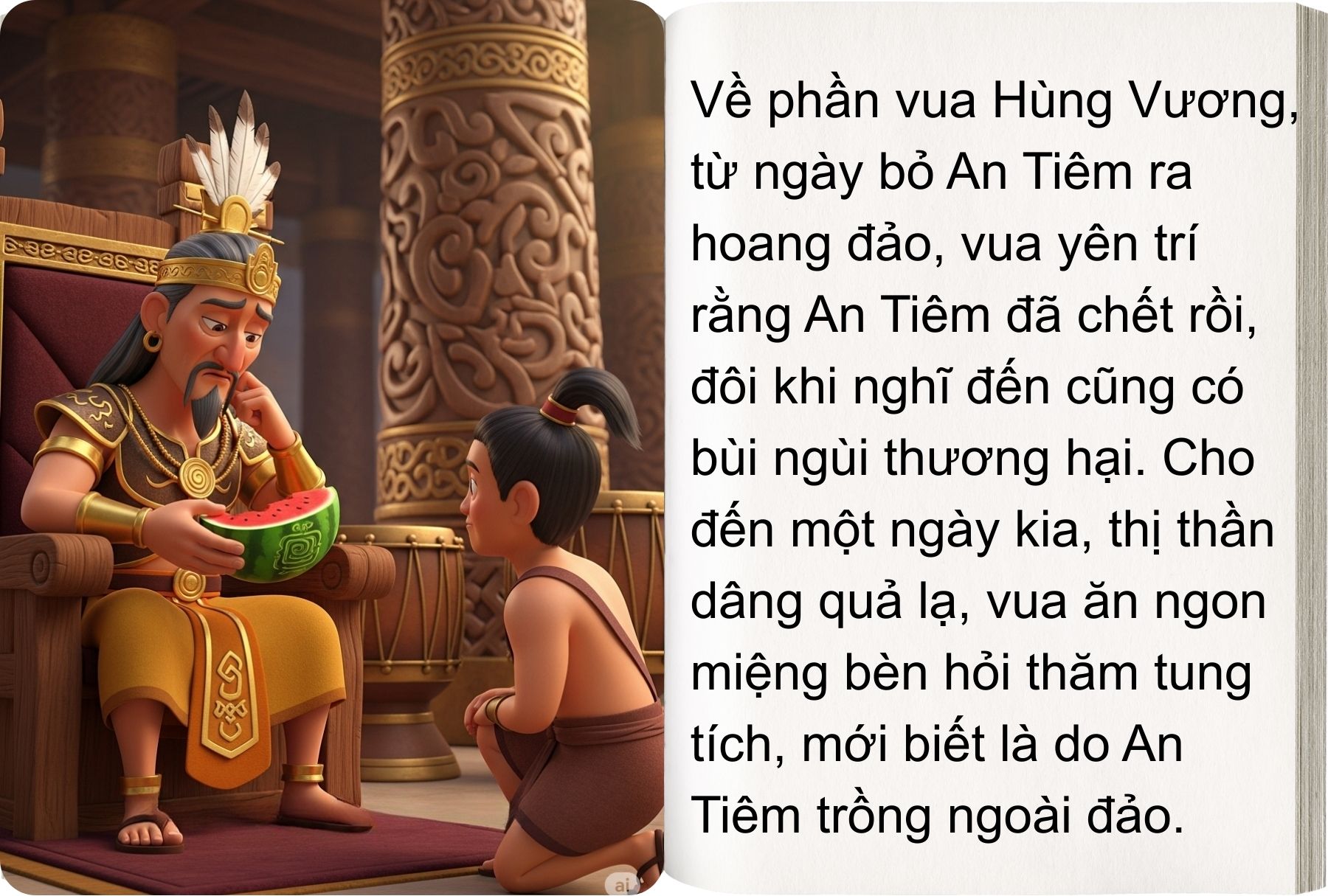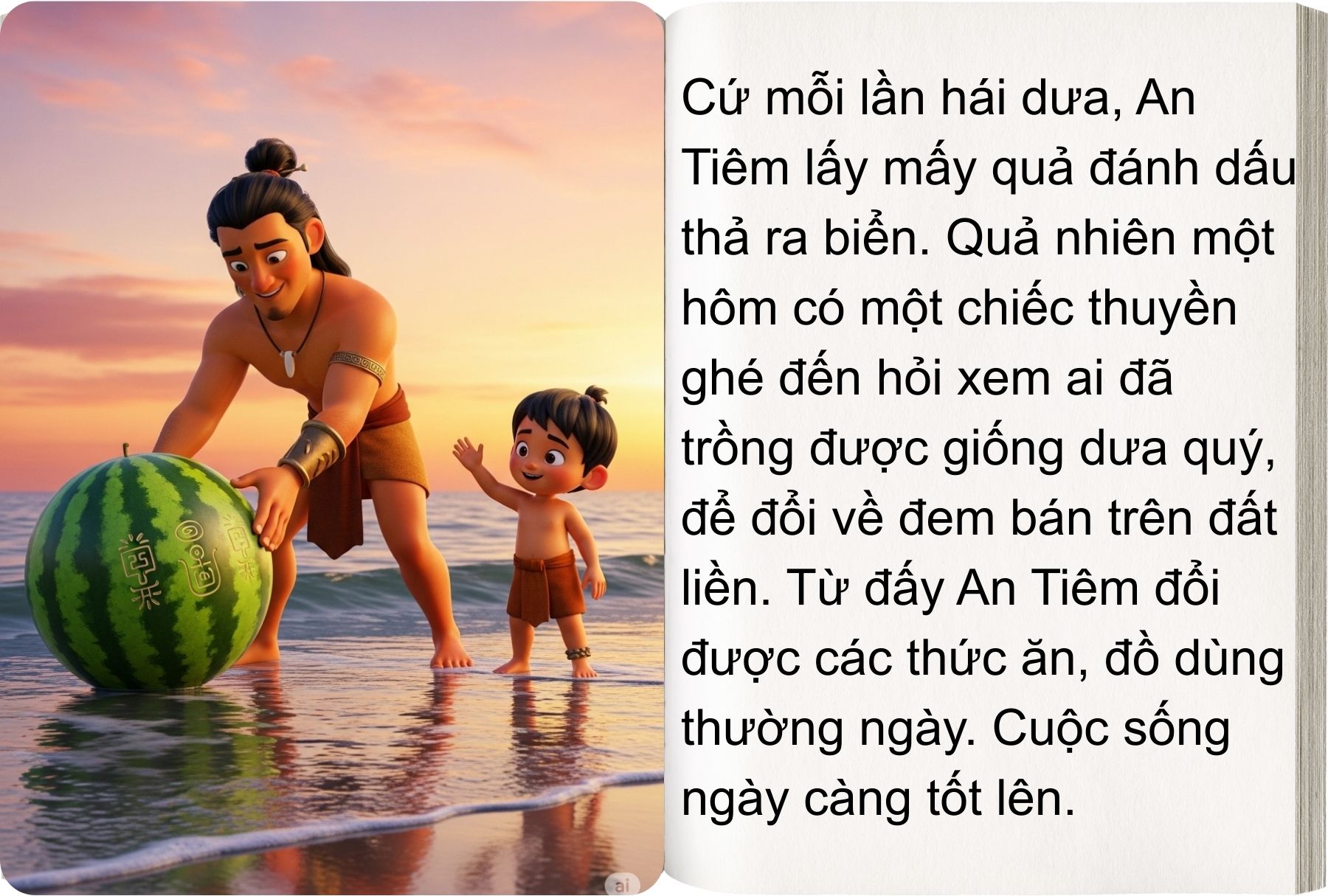 Ngày xửa ngày xưa, có chàng Mai An Tiêm bị đày ra đảo hoang cùng vợ con. Giữa biển trời mênh mông, không người giúp đỡ, họ chỉ còn lại đôi bàn tay, lòng kiên cường và một niềm tin không bao giờ tắt. Từ những hạt giống nhỏ bé, An Tiêm đã gây dựng nên cả một vườn dưa xanh mướt, mở ra con đường sống cho gia đình mình.