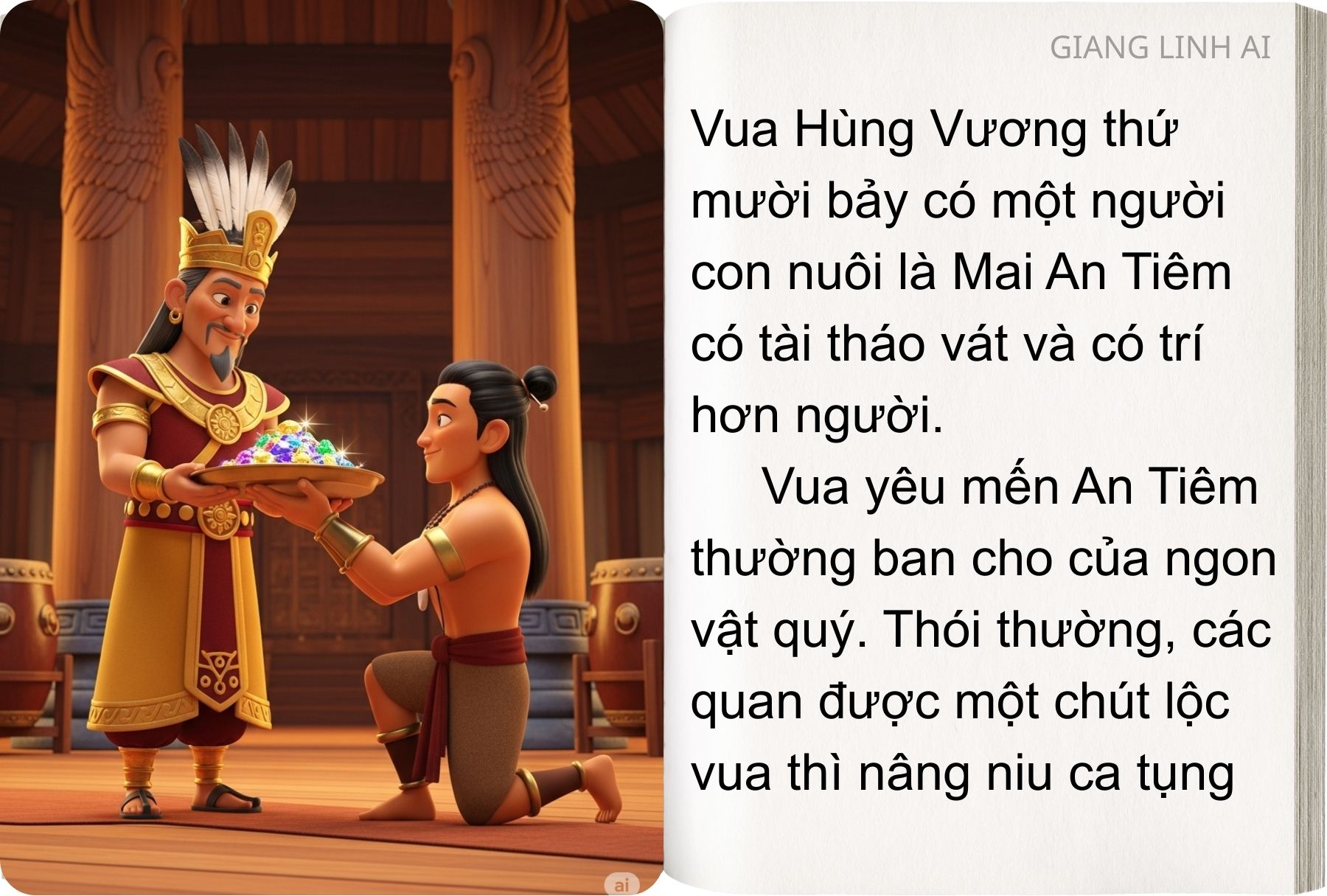 Đời xưa, thời vua Hùng Vương, đất nước ta có núi cao, có sông rộng, trời đẹp nắng vàng, nhưng đồng ruộng thưa thớt, hoa quả chưa có nhiều thứ thơm ngọt như bây giờ. Vua Hùng Vương thứ mười bảy có một người con nuôi là An Tiêm có tài tháo vát và có trí hơn người.