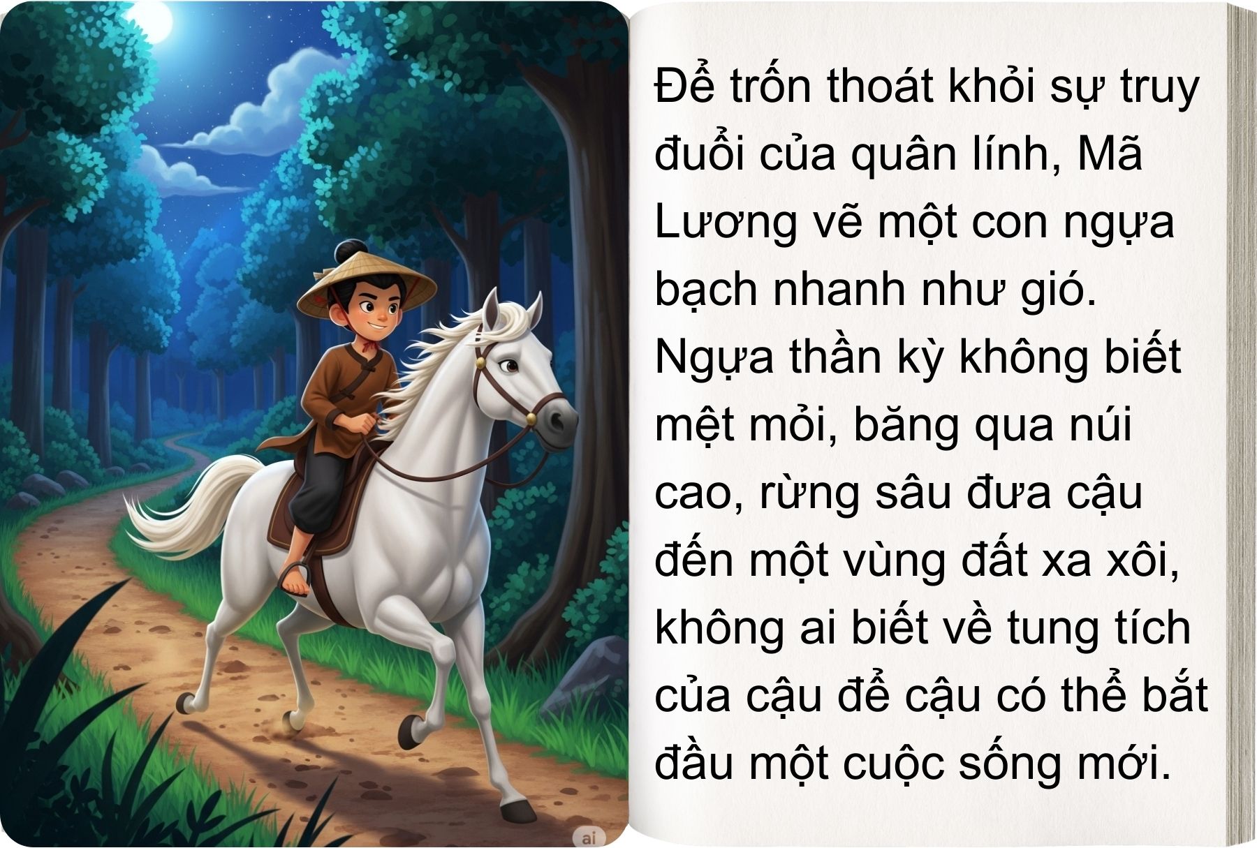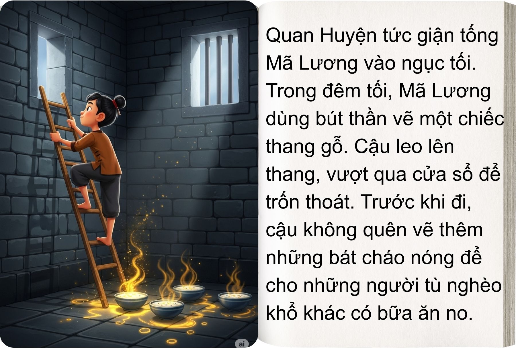 Tin về cây bút thần lan ra xa, đến tai quan huyện tham lam. Hắn sai lính bắt Mã Lương về, ép vẽ vàng bạc cho mình. Mã Lương cứng cỏi từ chối, bị giam vào ngục tối, bỏ đói giữa đêm đông giá rét. Nhưng cậu vẫn khôn ngoan dùng bút vẽ thang, vẽ ngựa, rồi trốn thoát.