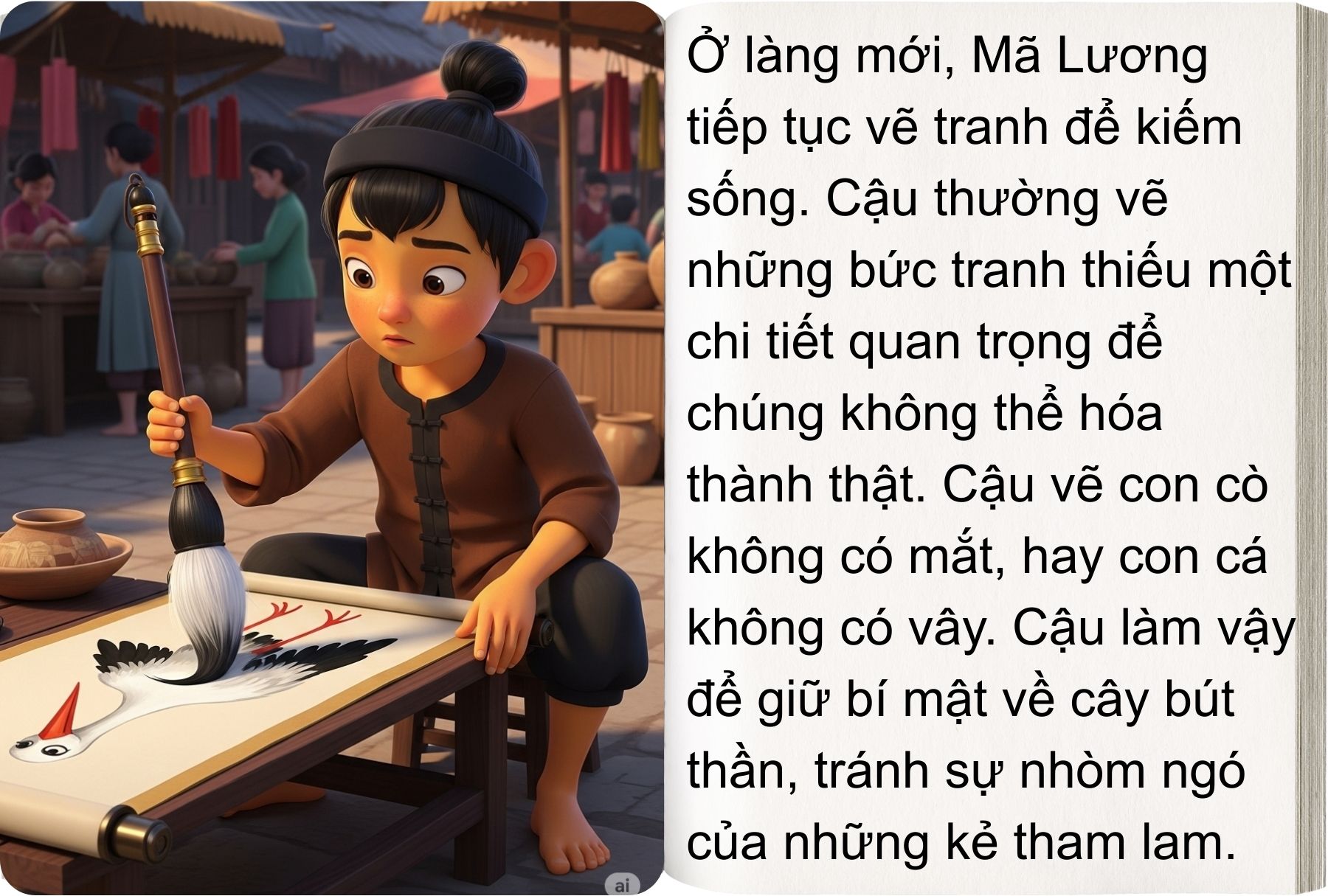 Sau đó, cậu đến sống ở một ngôi làng xa, giấu thân phận và tiếp tục vẽ tranh. Để tránh bị phát hiện, cậu cố tình vẽ thiếu mắt, thiếu chân để tranh không biến thành thật. Nhưng một lần, vô tình làm rơi giọt mực vào mắt con cò trong tranh, con cò bay ra khỏi giấy khiến bí mật bị lộ. Quân lính triều đình bắt Mã Lương đưa về kinh đô.