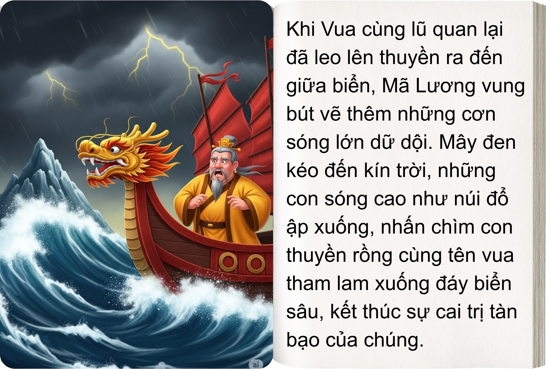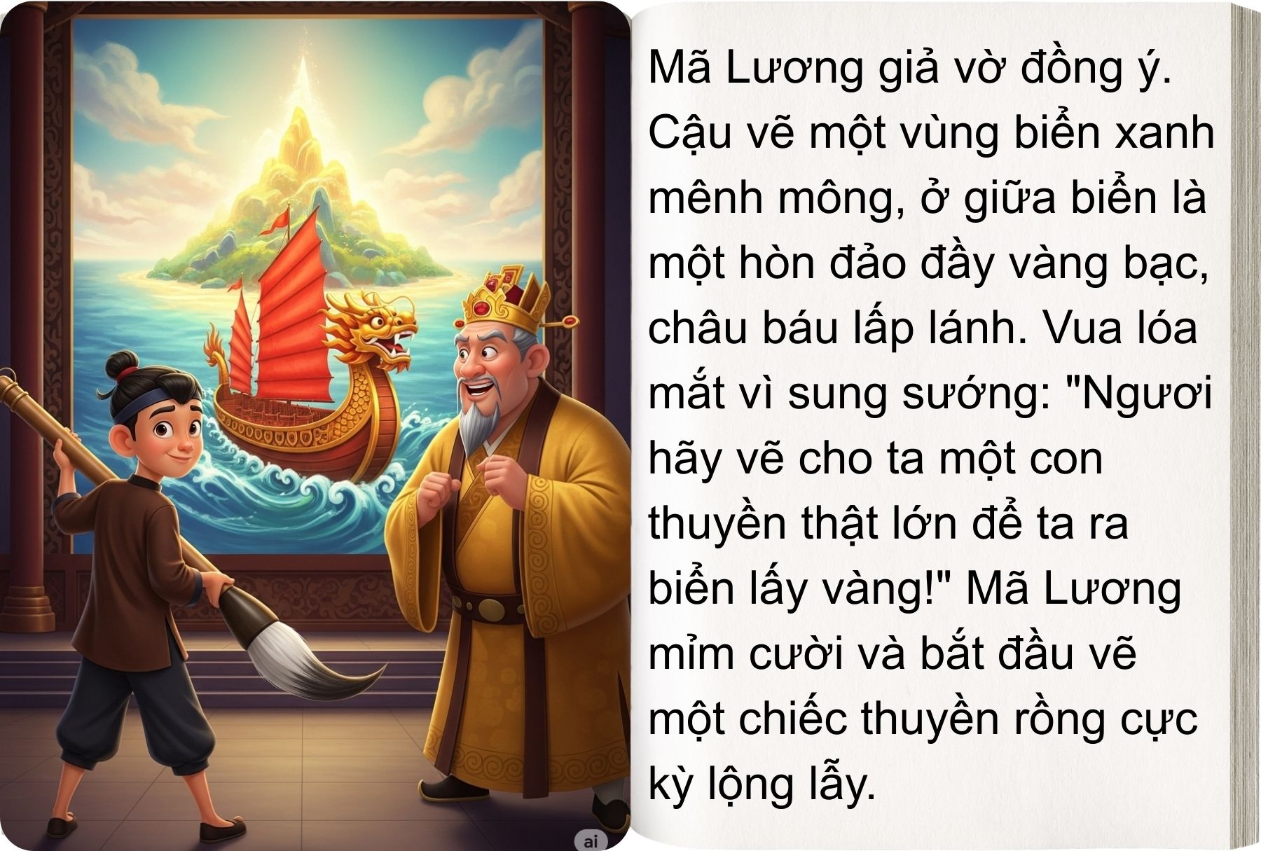 Biết chỉ mình Mã Lương dùng được bút thần, vua xuống nước nịnh nọt. Mã Lương giả vờ đồng ý, vẽ biển cả, vẽ đảo có cây hái ra vàng, rồi vẽ một chiếc thuyền thật lớn. Vua và đám quan tham hí hửng trèo lên thuyền ra khơi. Đợi thuyền ra xa, Mã Lương vung bút vẽ bão tố, sóng to gió lớn nổi lên, nhấn chìm cả lũ xuống biển sâu.