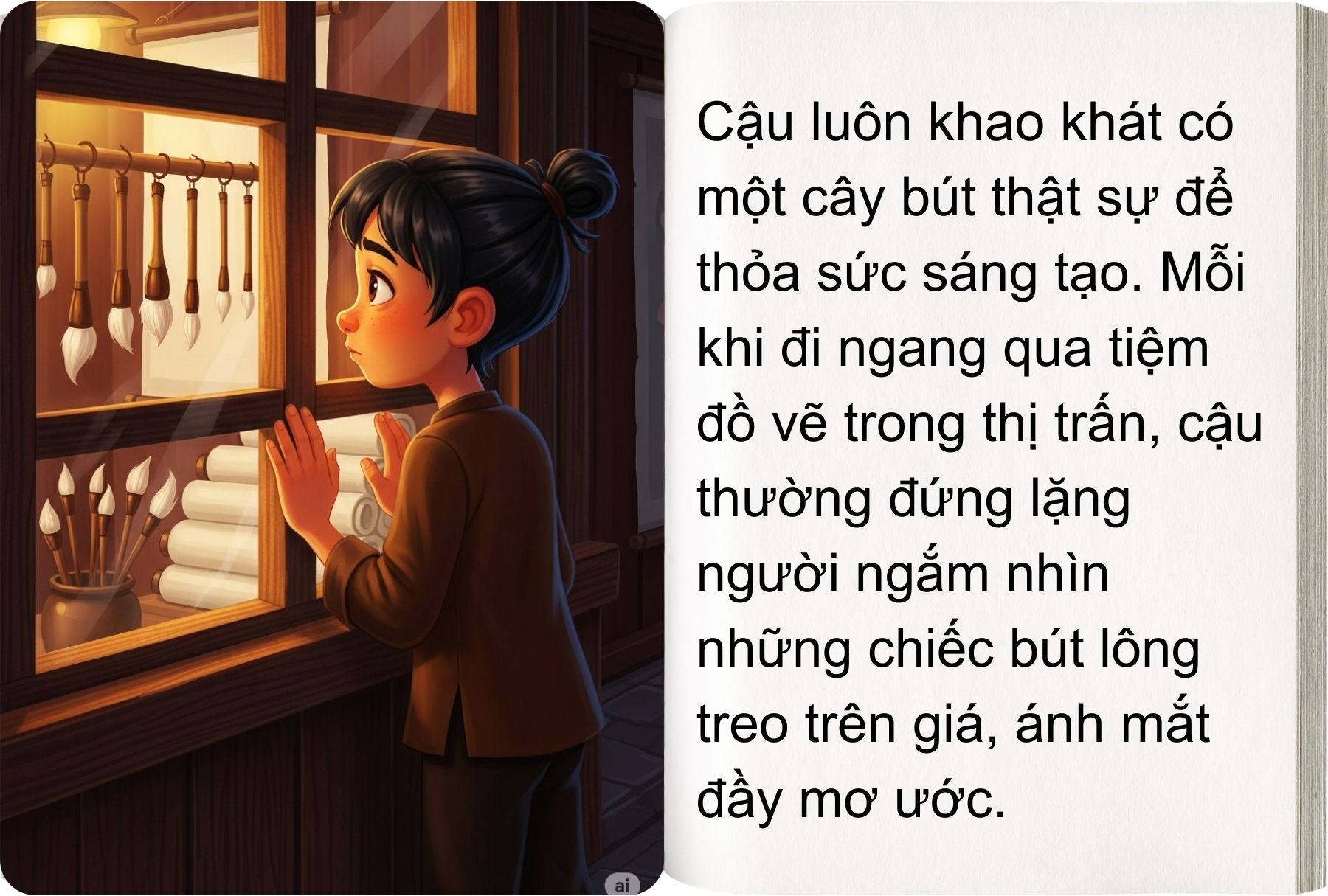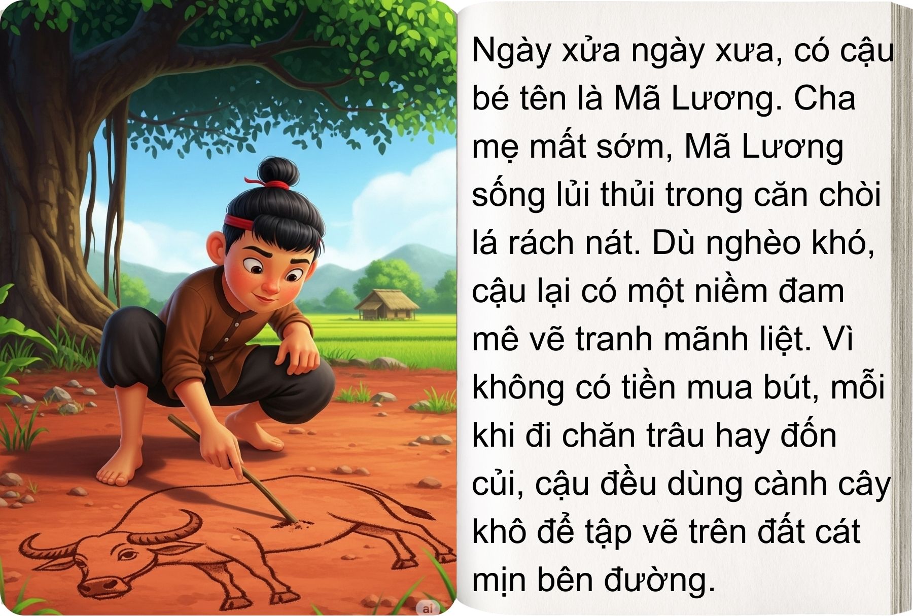 Ngày xửa ngày xưa, ở một làng quê nghèo, có một cậu bé tên là Mã Lương. Mồ côi cha mẹ từ nhỏ, Mã Lương sống một mình, ngày ngày vào rừng kiếm củi để đổi lấy miếng ăn. Tuy nghèo khó, cậu lại có niềm đam mê mãnh liệt với hội họa. Không có bút, không có giấy, Mã Lương vẫn kiên trì dùng que củi vẽ lên đất, lấy nước sông vẽ lên đá, dùng than bếp vẽ lên tường. Dù bị người đời chê cười, cậu vẫn không nản lòng, bởi ước mơ lớn nhất của Mã Lương là có thể dùng tranh vẽ để giúp đỡ những người nghèo khổ như mình.