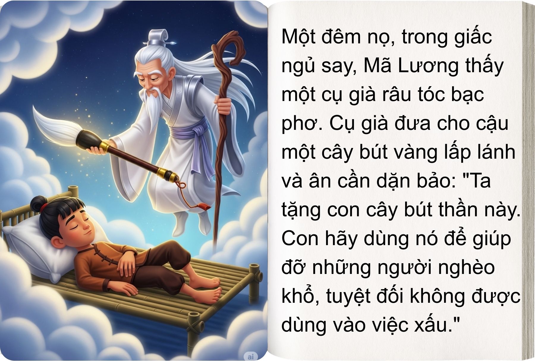 Một đêm nọ, khi đang ngủ, Mã Lương mơ thấy một ông tiên râu tóc bạc phơ bước ra từ ánh sáng rực rỡ và trao cho cậu một cây bút thần. Ông dặn rằng: “Cháu chỉ được dùng cây bút này để giúp đỡ người nghèo. Đừng bao giờ dùng nó cho kẻ tham lam.” Khi tỉnh dậy, Mã Lương không ngờ cây bút thần ấy thật sự đang nằm trong tay mình.