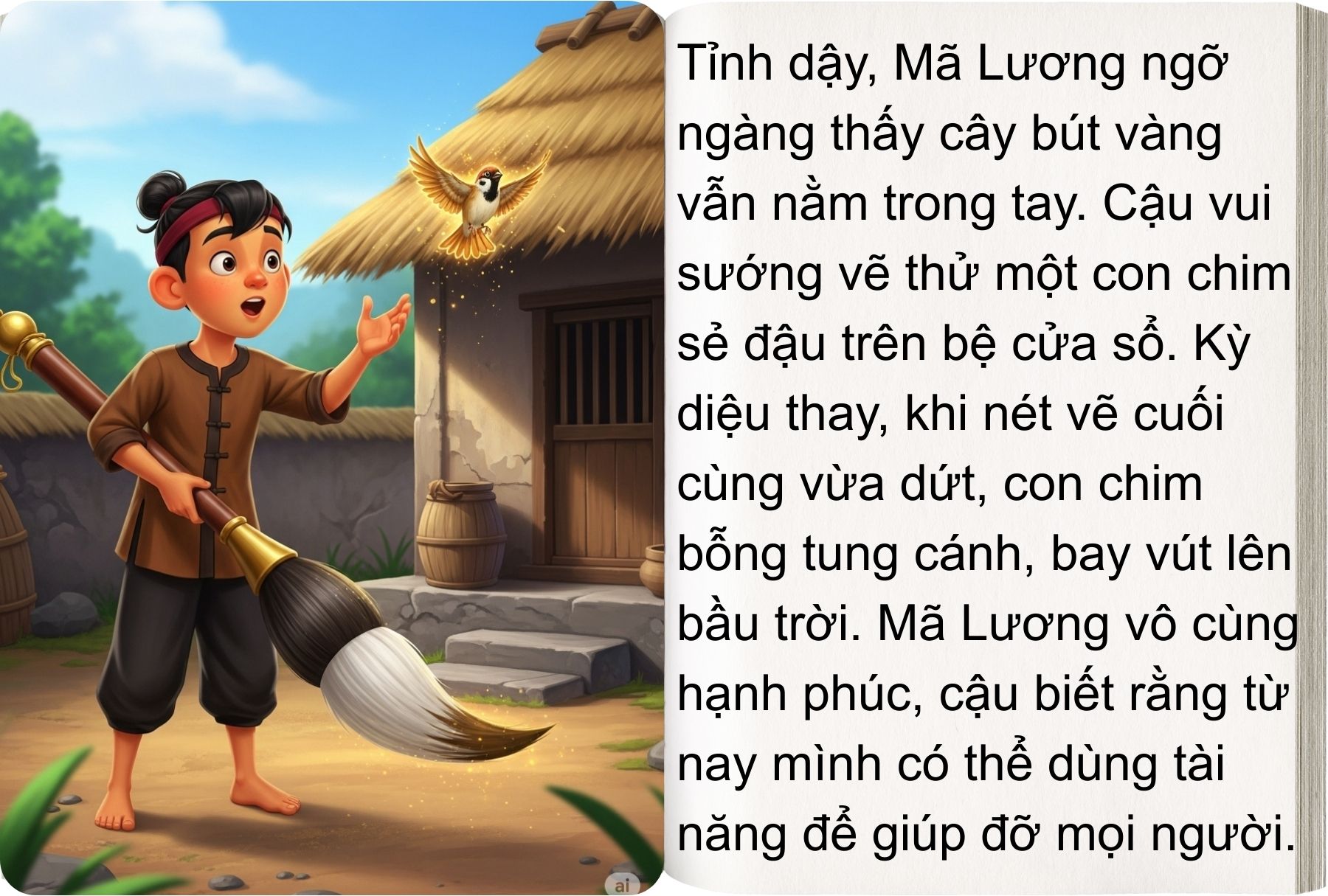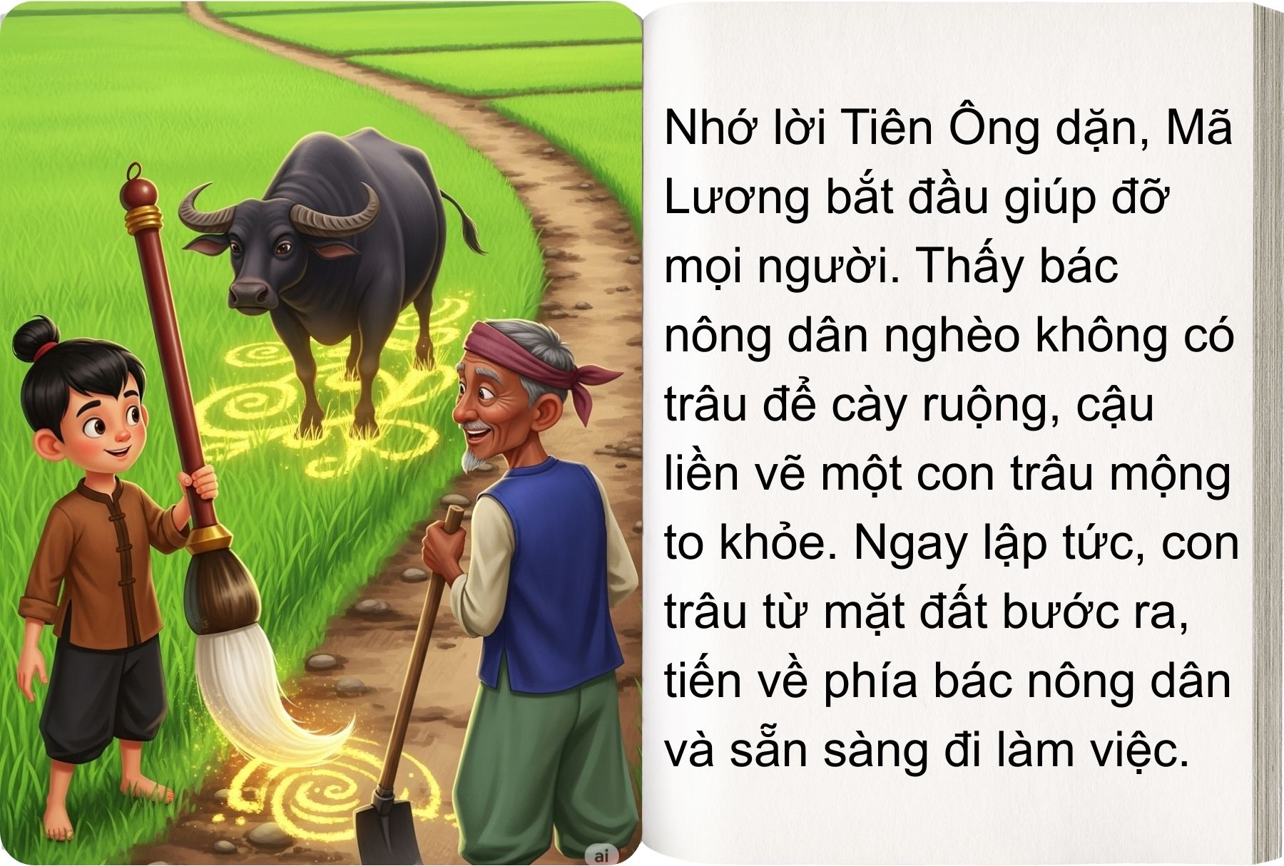 Từ đó, cậu bắt đầu vẽ trâu cho người không có trâu cày ruộng, vẽ cày, vẽ thóc, vẽ cá, vẽ chim… tất cả đều trở thành thật. Dân làng ai nấy đều cảm phục tấm lòng của Mã Lương.