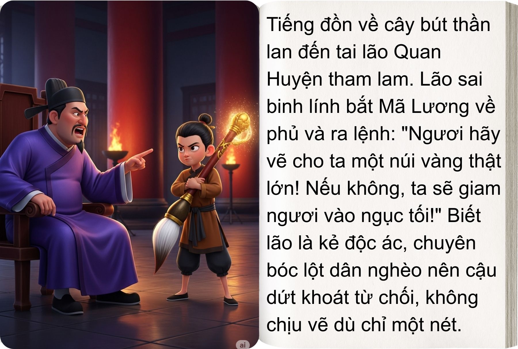 Nhà vua tham lam ra lệnh cho cậu vẽ theo ý mình. Nhưng Mã Lương không chịu, thậm chí cố tình vẽ sai khiến vua tức giận, giành lấy bút thần để tự vẽ. Nhưng cây bút trong tay kẻ xấu chẳng sinh ra vàng bạc, mà chỉ gây tai họa.